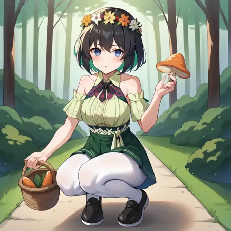 SelVel, Fol003, Sel_Est, short hair, blue eyes, black hair, green hair, colored inner hair, flower crown, flower wreath, dark green skirt, alt jewelry, alt high-waist skirt, alt pleated skirt, fringe trim, lime shirt, orange necklace, multicolored belt, multiple belts, alt off-shoulder shirt, alt collar shirt, black neckerchief, white pantyhose, pantyhose, bare shoulders, lime short sleeves, alt bracelets, pine tree print, seele vollerei,