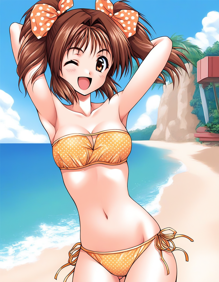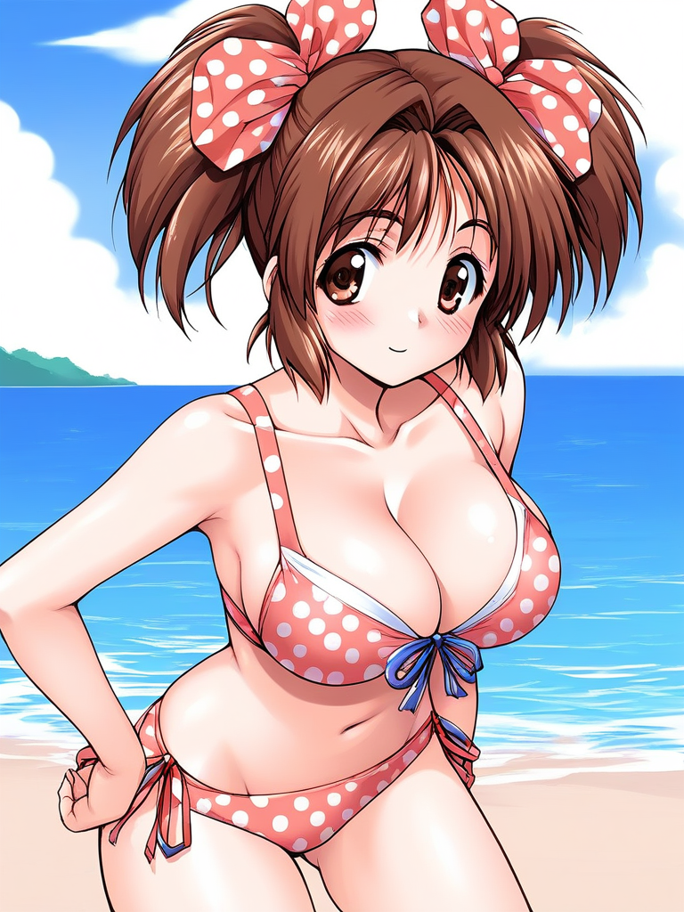 KinoshitaRumi, 갈색 머리, 트윈테일, 갈색 눈, 리본, 헤어 리본, 폴카도트, 짧은 트윈테일