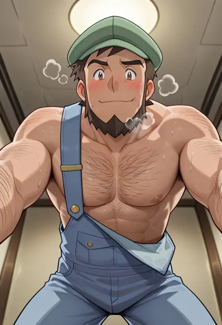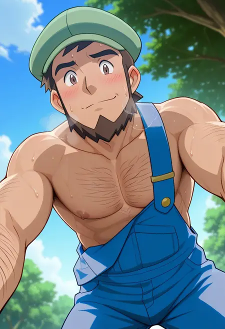 프롬프트: 메이어, 갈색 머리, 단발, 갈색 눈, 수염, 턱수염, 파란 작업복, 검은 속옷, 소매 말아올린, 기사 모자, 녹색 모자, 갈색 신발