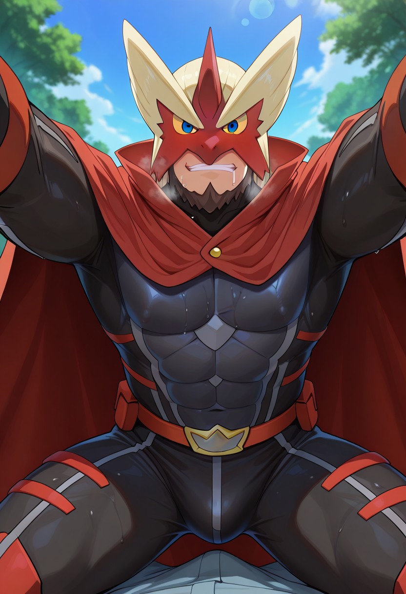 메이어, 수염, 턱수염, 블레이진 마스크 바디수트\(포켓몬\), 검은 바디수트\(블레이진 마스크\), 슈퍼히어로 바디수트\(블레이진 마스크\), 마스크\(블레이진 마스크\), 빨간 망토\(블레이진 마스크\), 검은 장갑