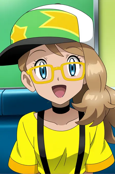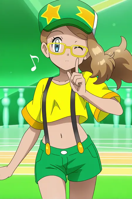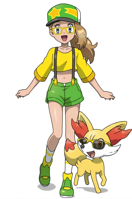 シャツ、帽子、へそ、短袖、靴、眼鏡、ショートパンツ、靴下、腹出し、キャミソール、サスペンダー、ベースボールキャップ、黄色いシャツ、緑のショートパンツ、緑の靴、サスペンダーショーツ、黄色のフレームの眼鏡