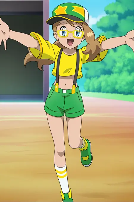 셔츠, 모자, 배꼽, 반팔, 신발, 안경, 반바지, 양말, 허리, 크롭탑, 스트랩, 야구 모자, 노란 셔츠, 녹색 반바지, 녹색 신발, 스트랩 반바지, 노란 프레임 안경