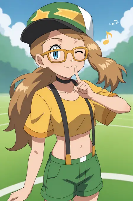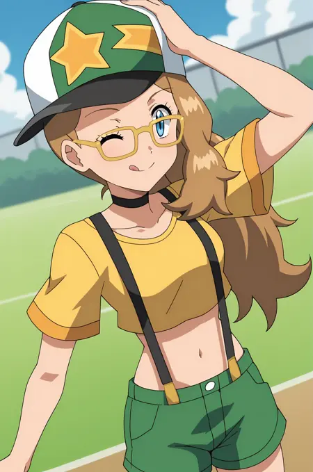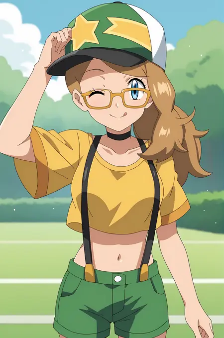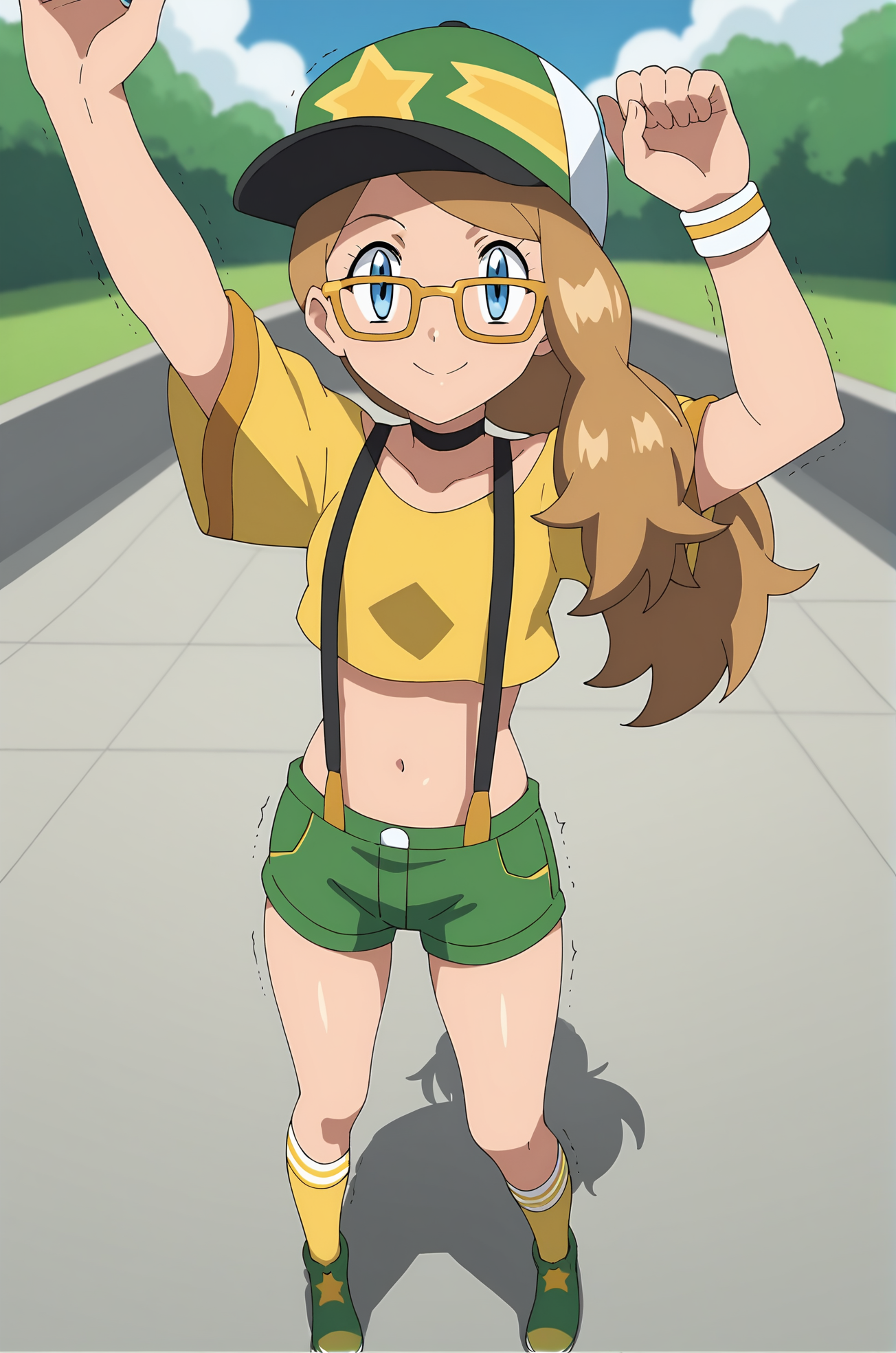 shirt, hat, navel, short sleeves, shoes, glasses, shorts, socks, midriff, crop top, suspenders, baseball cap, yellow shirt, green shorts, green footwear, suspender shorts, yellow-framed eyewear