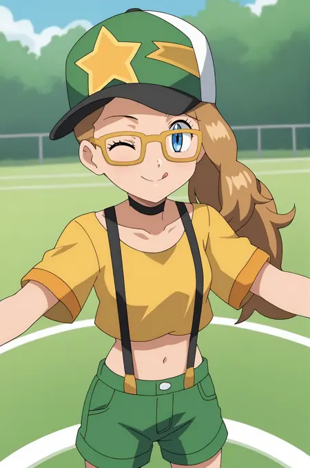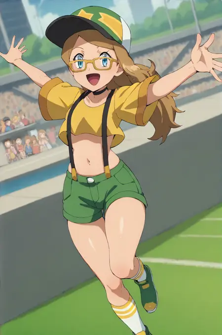 シャツ、帽子、へそ、短袖、靴、眼鏡、ショートパンツ、靴下、腹出し、キャミソール、サスペンダー、ベースボールキャップ、黄色いシャツ、緑のショートパンツ、緑の靴、サスペンダーショーツ、黄色のフレームの眼鏡