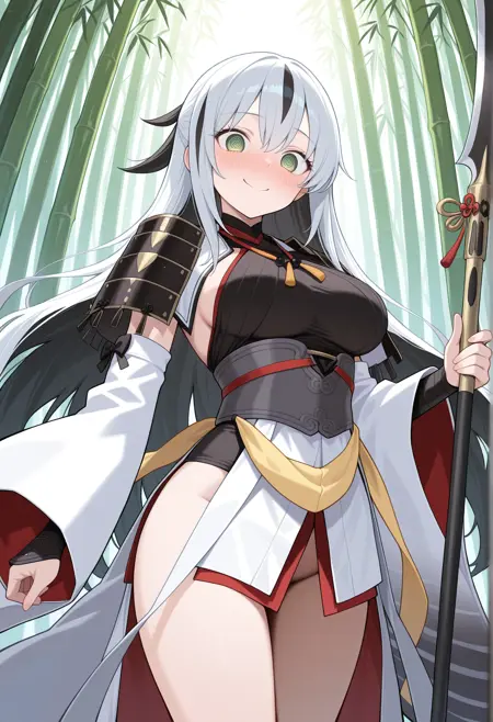 복장 1: @ @, 긴 머리, 다색 머리, 흰 머리, 검은 머리, 녹색 눈, 일본 복장, 사이드부브, 넓은 소매, 분리형 소매, 힙 벤트, 일본 갑옷