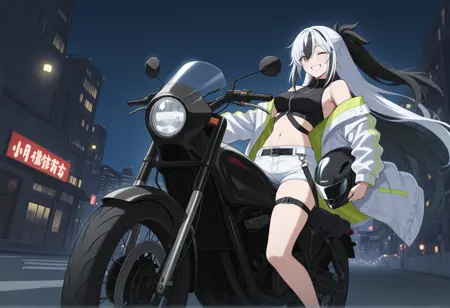 복장 3: 매우 긴 머리, 다색 머리, 흰 머리, 검은 머리, 녹색 눈, 꼬리머리, 성숙한 외모, 텅탑, 재킷, 어깨 드러난 스타일, 반바지, 벨트, 단일 허벅지 스타킹, 허벅지 스트랩