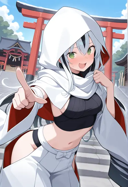 복장 2: @ @, 긴 머리, 다색 머리, 흰 머리, 검은 머리, 녹색 눈, 일본 복장, 사이드부브, 넓은 소매, 분리형 소매, 힙 벤트, 배꼽, 복부, 스카프, 캐피렛