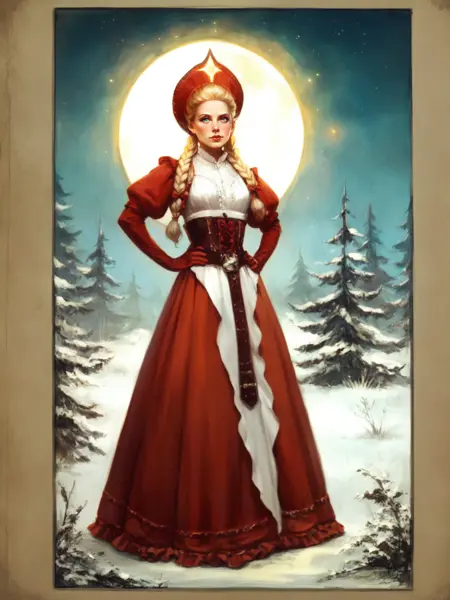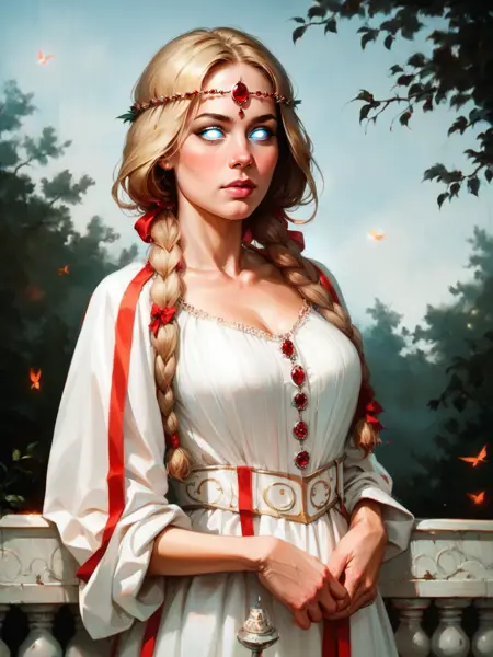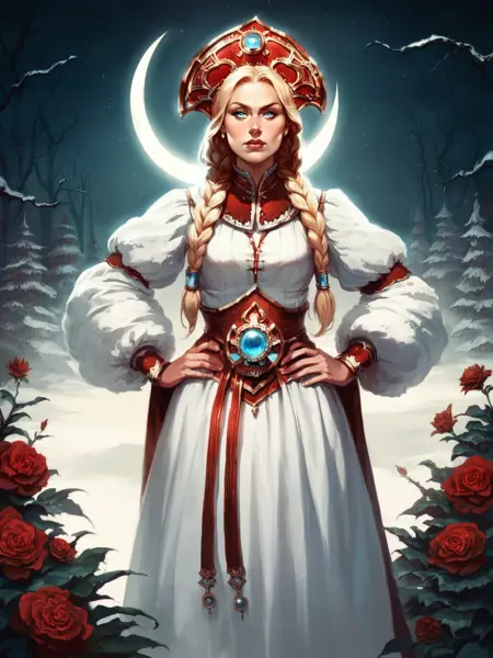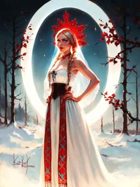 의복 태그: 코코시닉 모자, 장식이 그려진 붉은 로브가 있는 전통적인 흰색 드레스, 전통 의복, 목걸이 형태의 머리띠 등