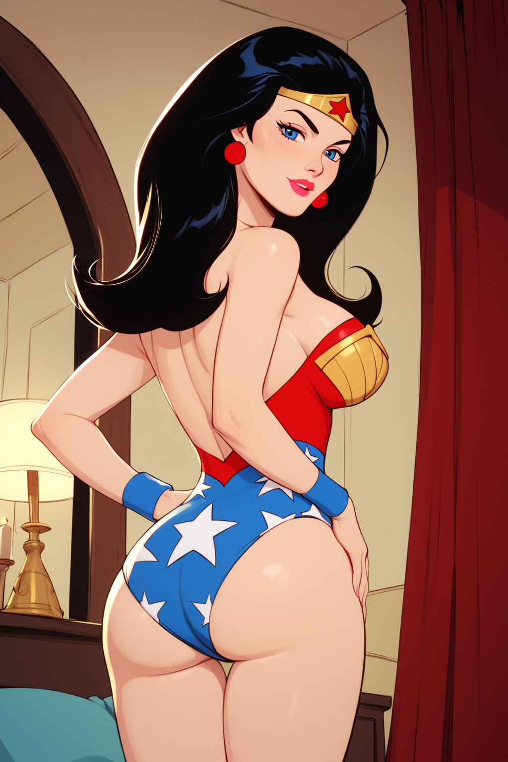 Hero Costume: bare shoulders, cleavage, leotard, tiara, jewelry, earrings, wristband, star print, boots