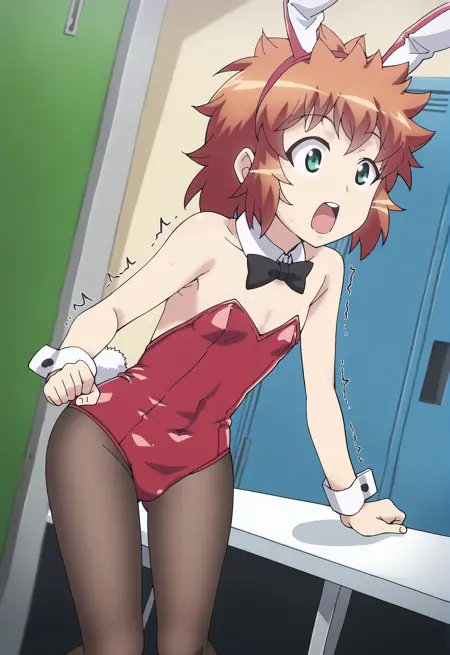 1girl, green eyes, orange hair, medium hair, messy hair, bangs, flat chest,복장: