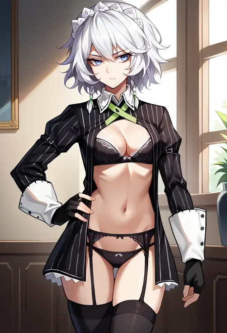 기본 복장: 메이드 헤드기어, 줄무늬 옷, 검은 셔츠, 줄무늬 셔츠, 칼라 셔츠, 긴 소매, 검은 장갑, 손가락 없음 장갑, 검은 스커트, 검은 허벅지 양말