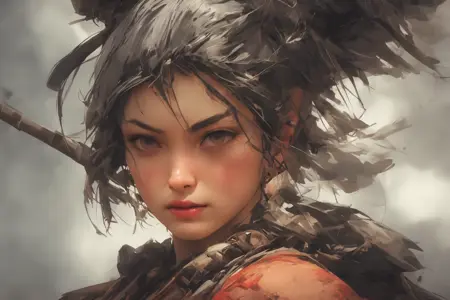 手に剣を持っている女性、髪に髪飾りをつけており、大きな羽飾りをかぶり、遠くを見つめる様子、NIJIFTB