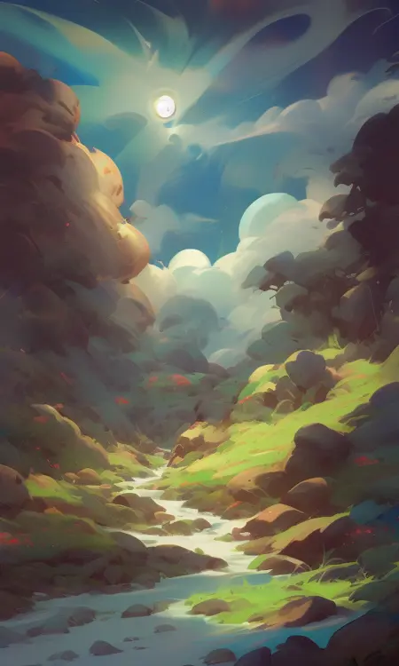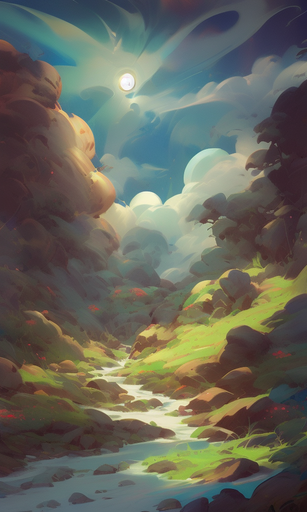 岩の道を描いた絵、両側に花と岩があり、空背景に雲と太陽が木々と花々の間から差し込んでいる、NIJIFTB