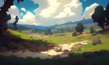 川と木々が背景、遠くの丘にある家、青空に白い雲、NIJIFTB