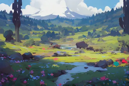 花や木々が前景にある山の谷間を流れる小川が見える風景、背景に山々、NIJIFTB