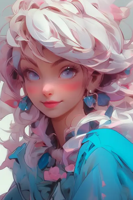 ピンクの髪と青い目のコスチュームキャラクター、ブルーのドレスとピンクのイヤリング、肩にピンクの花の模様、NIJIFTB