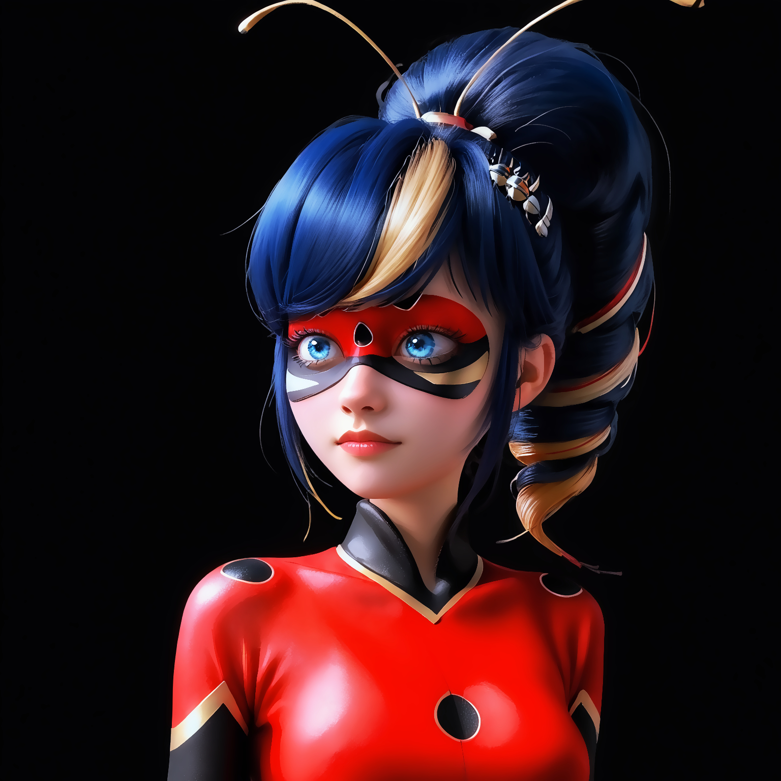 触发词:imtdshadybug, black hair, red hair, two tone hair, multicolored hair, red eyes, double buns, black lips, streaked hair, short hair, swept bangs, ahoge.