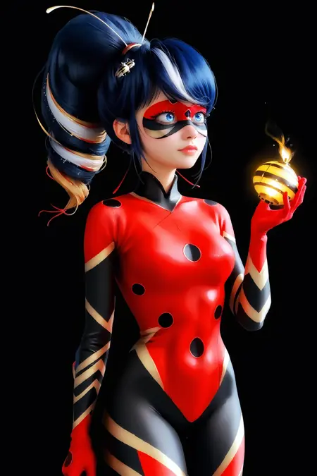 프롬프트: 1girl, mask, domino mask, bodysuit, blue eyes, ponytail, blue hair, black hair, blonde hair, multicolored hair, drill hair, superhero, gloves, single hair bun, antennae, skin tight, red bodysuit, black bodysuit, black bodysuit bottom