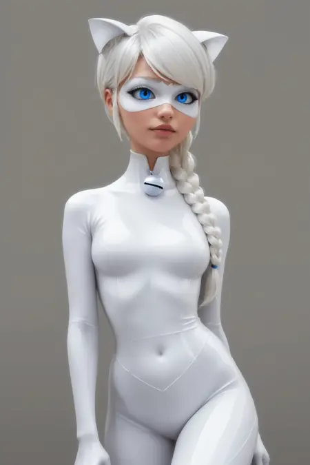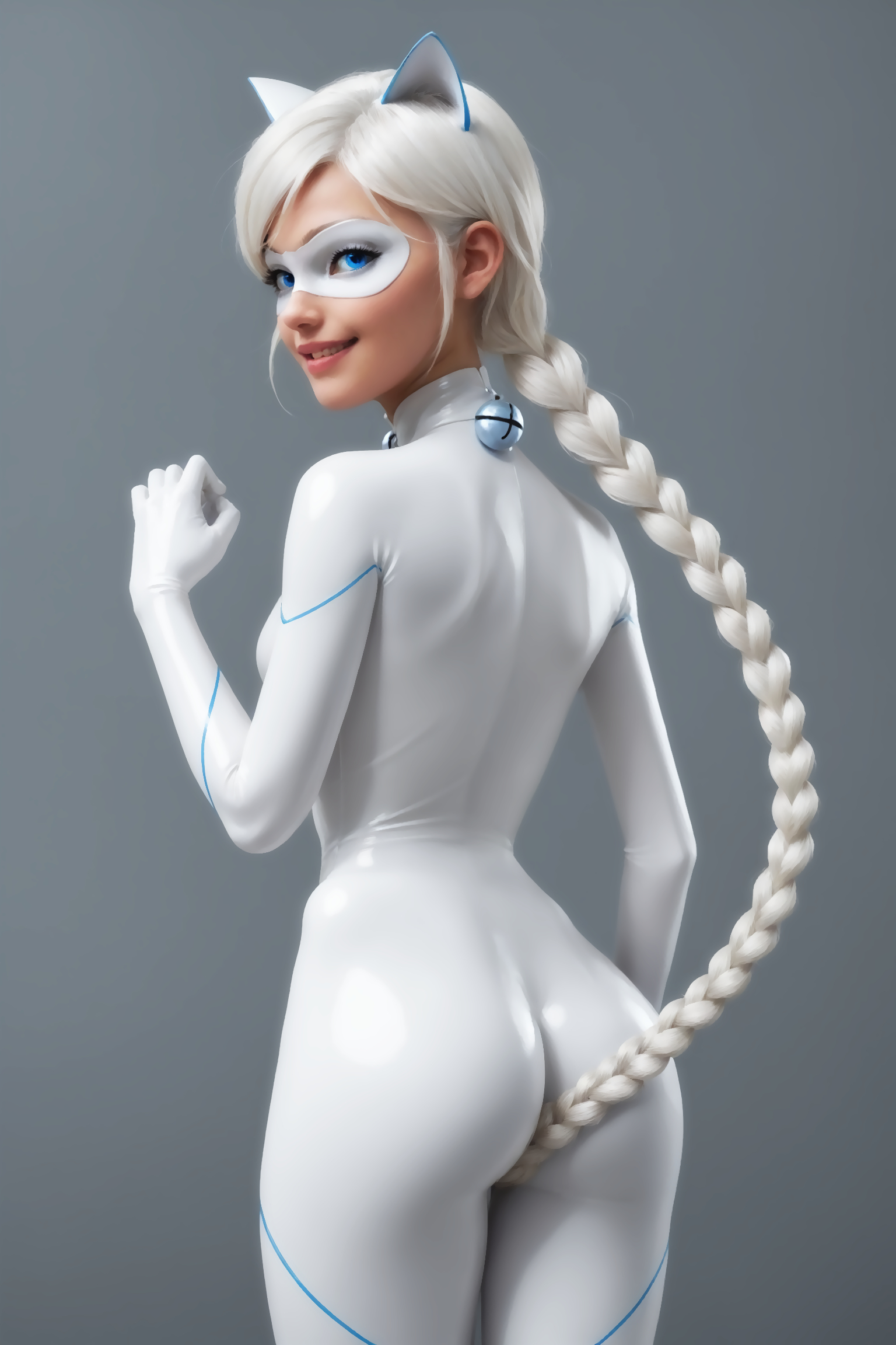 触发词:imtdladyblanc, white hair, bodysuit, white bodysuit, blue eyes, cat ears, braid, single braid, mask, very long hair, skin tight, neck bell, braided ponytail.
