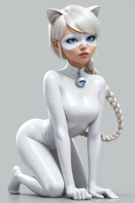 Trigger : imtdladyblanc, white hair, bodysuit, white bodysuit, blue eyes, cat ears, braid, single braid, mask, very long hair, skin tight, neck bell, braided ponytail.