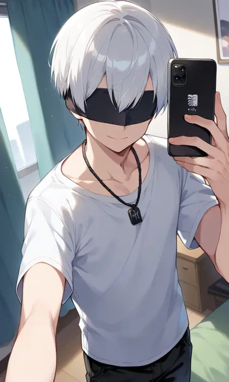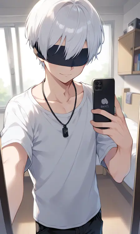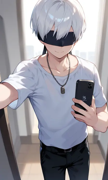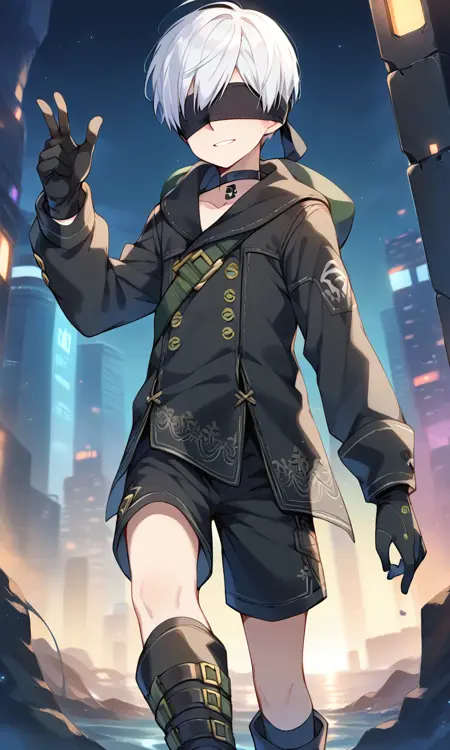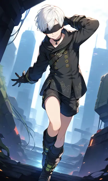 トリガーワード: 9s、白髪、目隠し、黒目隠し、手袋、チョーカー、ジャケット、ショートパンツ、ブーツ、長袖