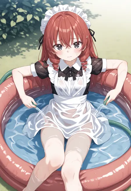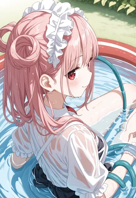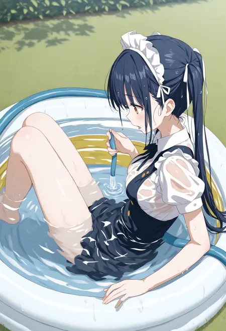 Animagine는 원래 학습되어 있지만 대부분 플로터를 생성하므로 비닐 풀의 형태로 교정합니다. 원하는 수영복을 입힌 후 partially submerged, water, wet, outdoors, hose, barefoot, day, lying 등을 추가하면 더 자연스러워질 것입니다.