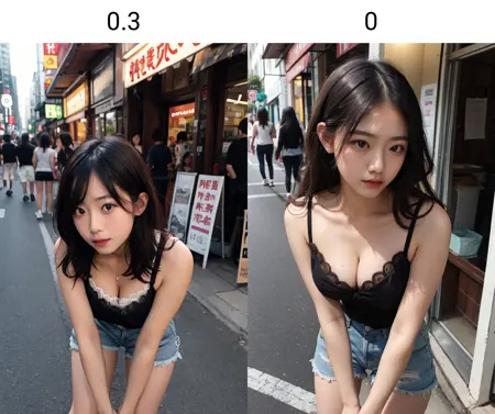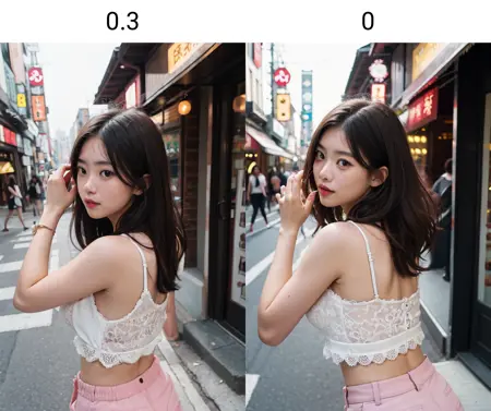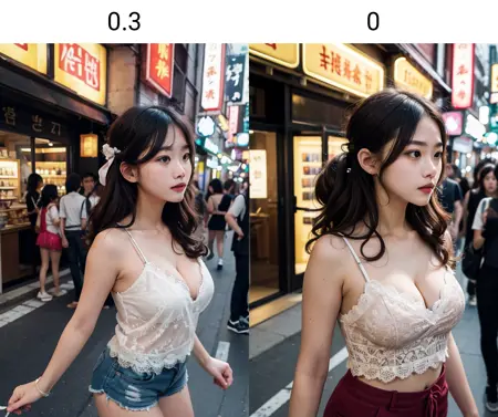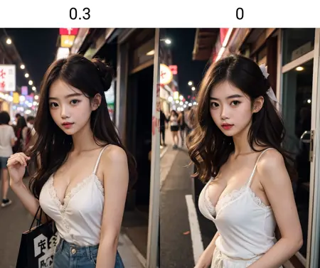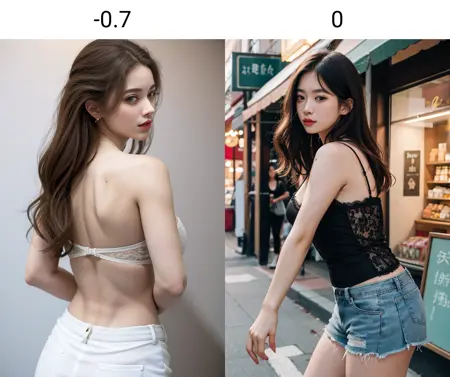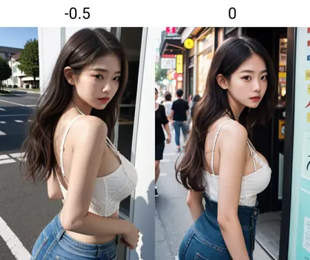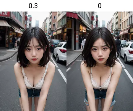 推奨される重みは0.3です。高すぎると、プロンプトがうまく機能しなくなります。髪の高さを「わずかに」低くする効果がありますが、逆の結果が生じることも稀にあります。頭から体までの長さの比率を改善し、全体的にアジア人が慣れ親しんでいる美的感覚に近づきます。