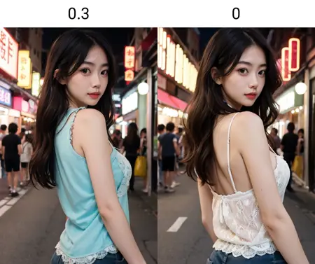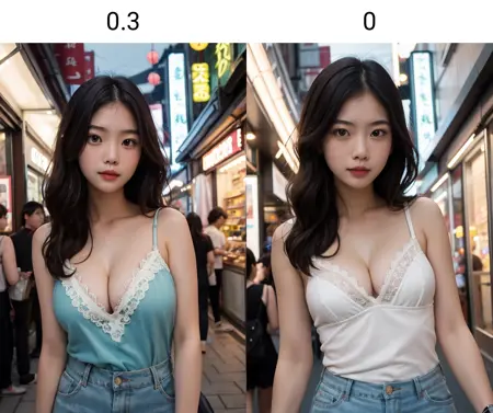 中央分けの髪線と額の比率はわずかに減少し、「かわいさ」や「少女感」が向上します。ただし、元のプロンプトはさらに改善可能です。欠点として、彩度が低すぎ、色調がポラロイドに似ており、よりレトロな印象になります。