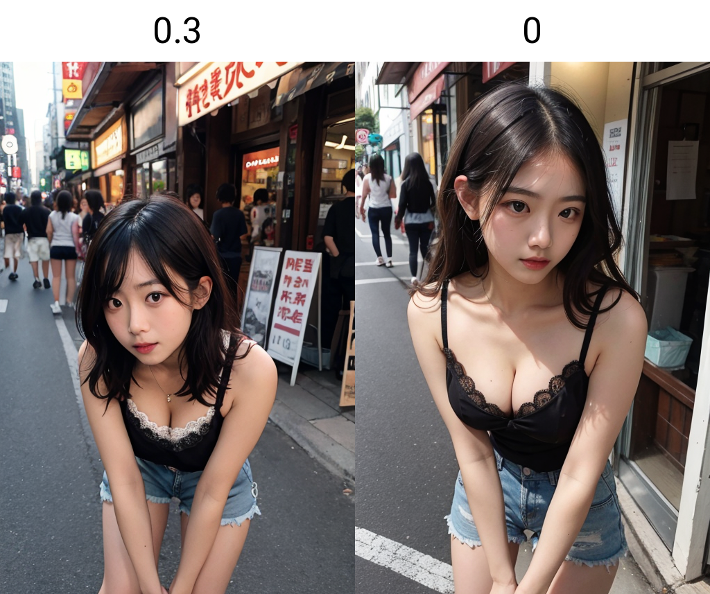 (これは「髪の高さスライダー」LoRAとの違いで、あまりにランダムであり、人物や体の比率、服、背景に過度な影響を与えます)