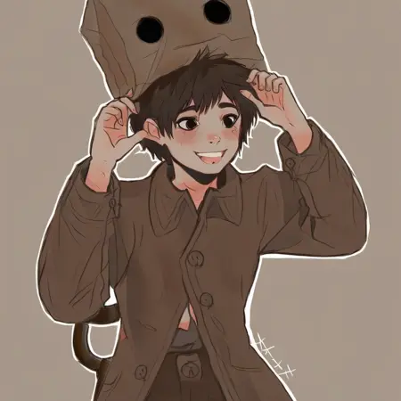 Boy wearing a white shirt and brown pants under a trenchcoat