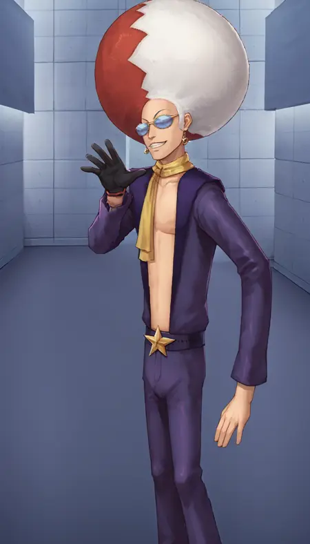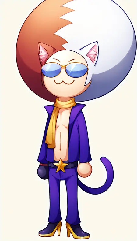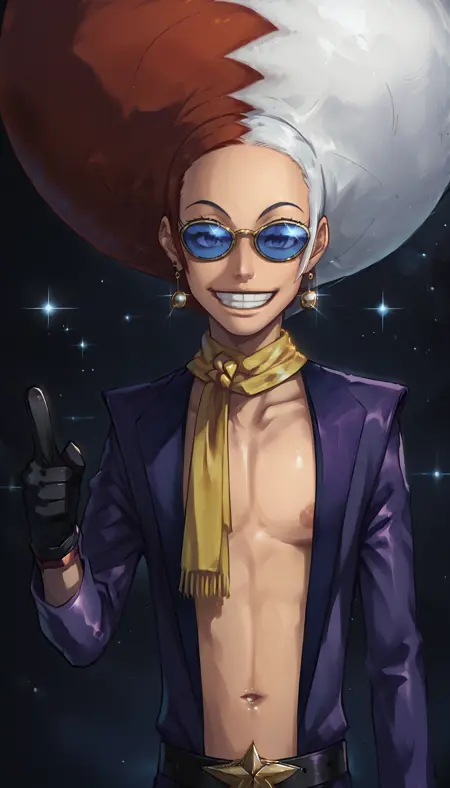 의상 태그: 스카프, 선글라스, 보라색 정장, 벌어진 옷, 보라색 바지, 한쪽 장갑, 벨트, 하이힐, 귀걸이