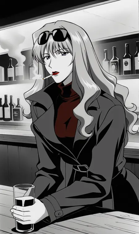 メイン衣装-'金髪、長い髪、青い目、リップストック、トレンチコート、赤いチュールネックセーター、ブーツ'