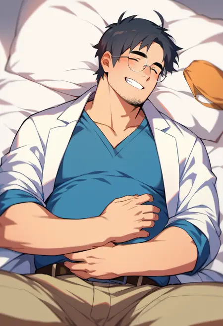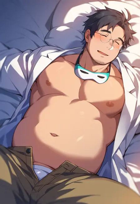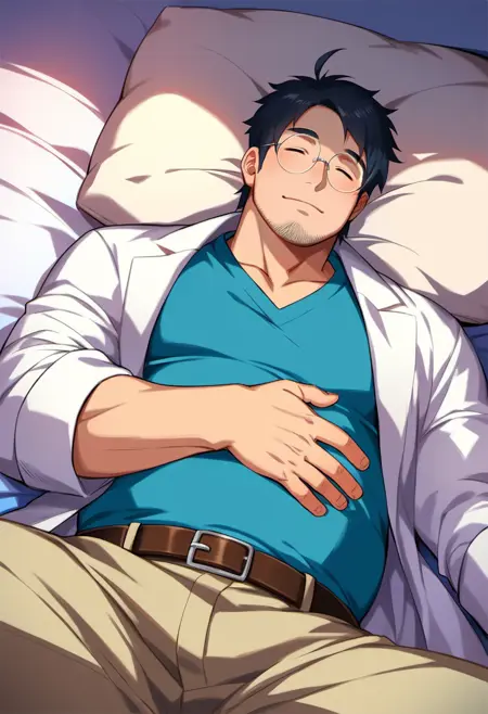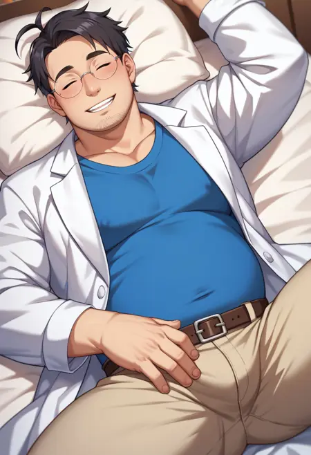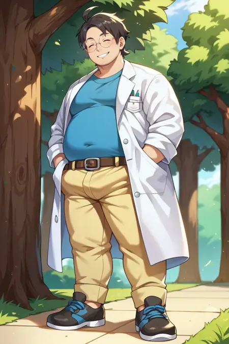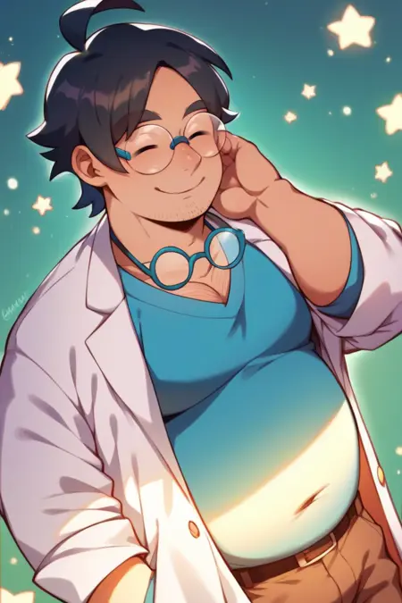 Professor Neroli,black hair, ahoge, closed eyes, round glasses, facial hair, stubble, chubby, plump