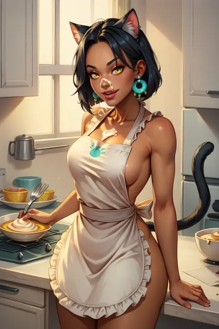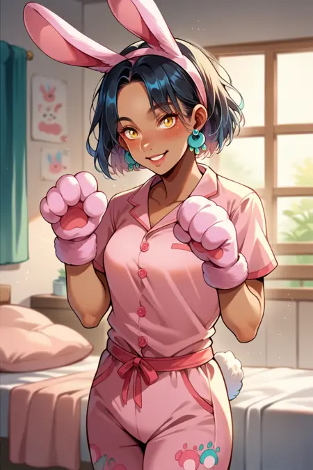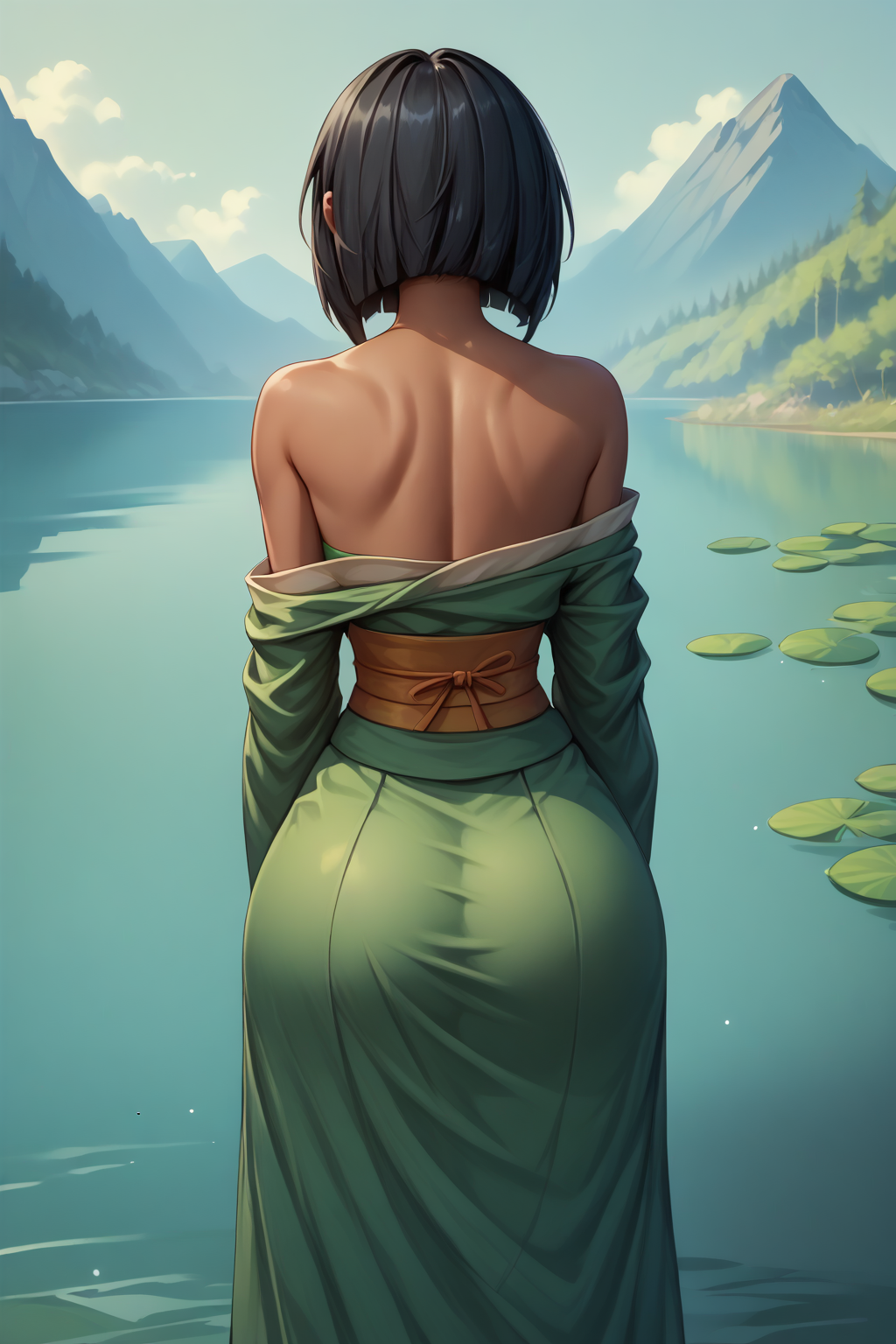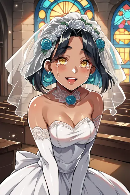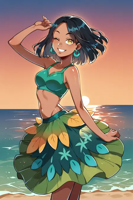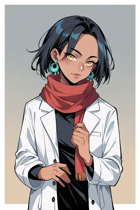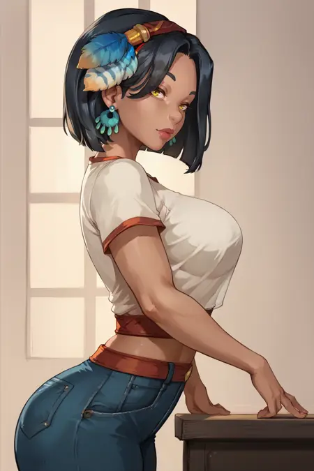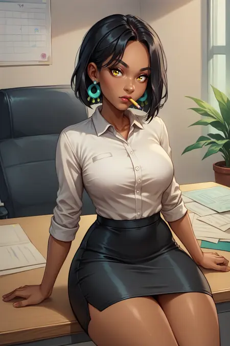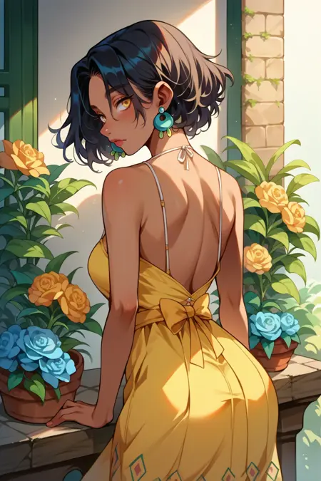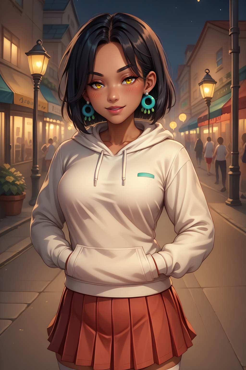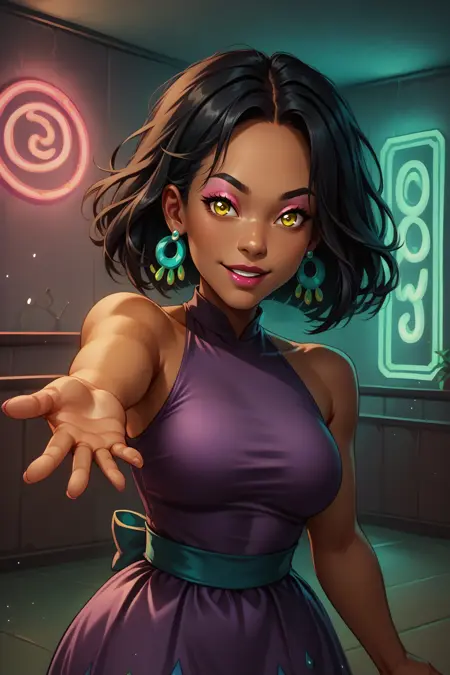 주 프롬프트: NSSoniaPortia, 검은 피부 여성, 검은 머리, 중간 길이 머리, 노란 눈, 청록색 귀걸이
