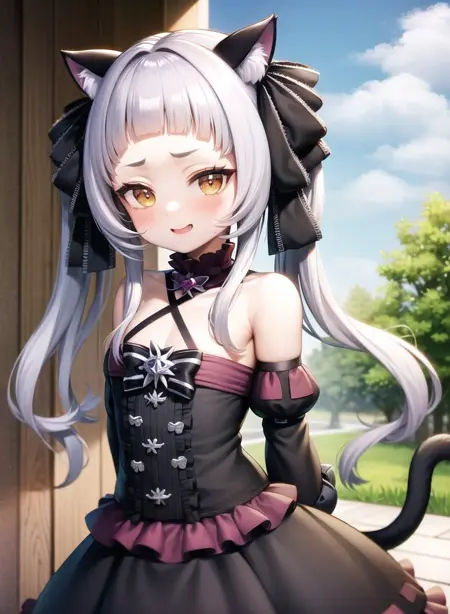 双马尾, 动物耳朵毛绒, 哥特洛丽塔, 洛丽塔风格, 交叉背心裙, 猫耳, 猫娘, 长裙, 后颈开领, 多层裙, 蕾丝裙, 中心褶边, 脱肩袖, ShionGothic