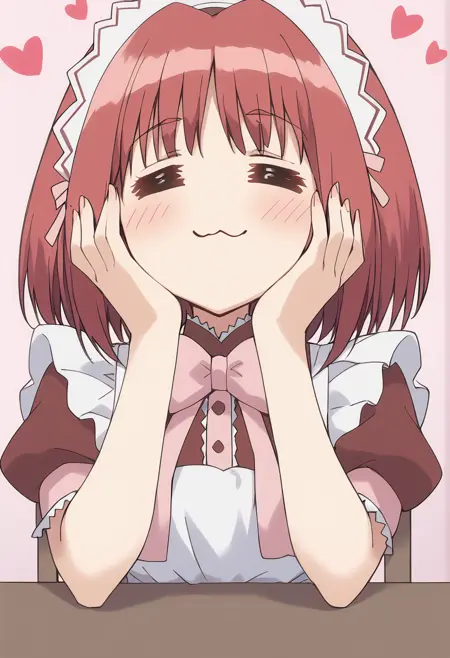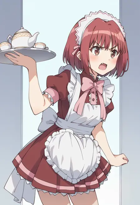 momomiya ichigo, waitress, short hair, red hair, pink hair, brown eyes, red eyes, eyelashes, eyebrows visible through hair, red dress, frilled dress, puffy short sleeves, pleated skirt, maid apron, white apron, pink bowtie, frills, maid headdress, hair ribbon, pink ribbon, pink socks, black footwear, boots
