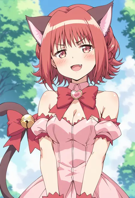 mew ichigo, short hair, pink hair, red hair, pink eyes, red eyes, eyelashes, eyebrows visible through hair, cat ears, fang, pink dress, frills, puffy detached sleeves, detached sleeves, puffy short sleeves, arm garter, bubble skirt, bare shoulders, pink bow, red bow, pink choker, bowtie, red neckwear, detached collar, brooch, red gloves, pink gloves, cat tail, tail bell, tail bow, red footwear, pink footwear, knee boots