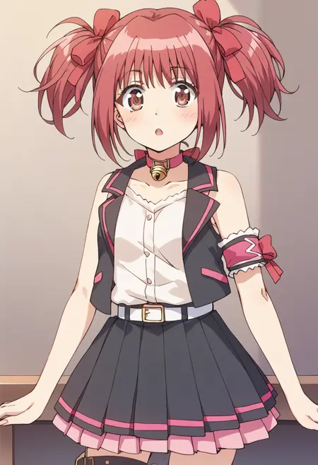 momomiya ichigo, short hair, short twintails, red hair, pink hair, sidelocks, brown eyes, red eyes, eyelashes, eyebrows visible through hair, hair ribbon, red ribbon, neck bell, red choker, black vest, open vest, white shirt, collar, sleeveless shirt, bare shoulders, black skirt, pink skirt, frilled skirt, pleated skirt, layered skirt, thigh strap, white belt, buckle, armband, arm ribbon, black footwear, knee boots