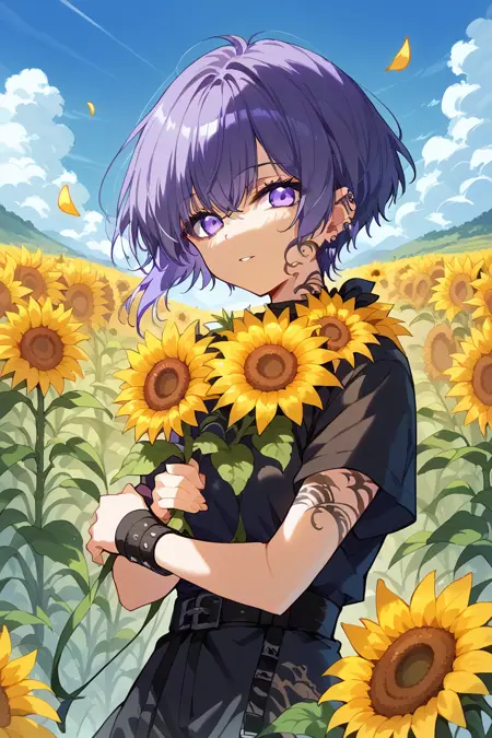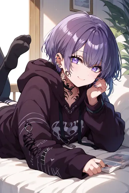 소피아와 1girl을 사용. 다양한 의상을 원한다면 샘플 이미지의 프롬프트를 참고. 헤어스타일은 단발, 보라색 머리. 모든 요소가 잘 작동. 헨티에도 적합.