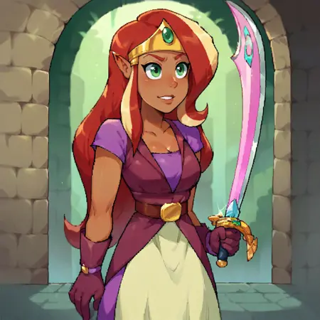 Princess Arzette, the main character of the indie game Arzette: The Jewel of Faramore! A somewhat silly game that is a homage to the CDi Zelda games, the cutscenes in this are particularly good. Trained using the cutscene art.