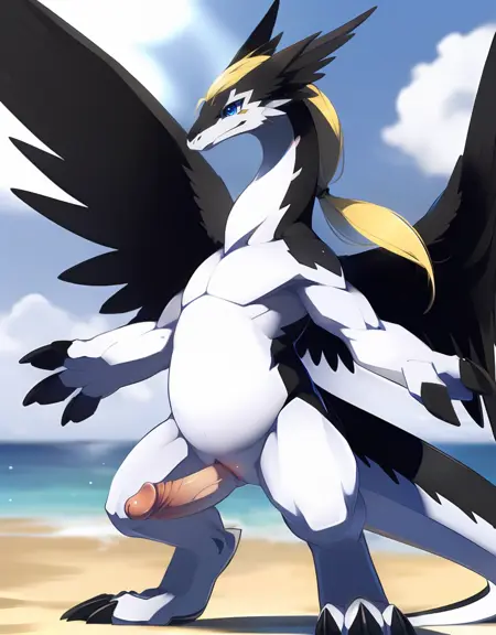 Related words : grey skin, colored skin, black fur, grey fur, two-tone fur, blonde hair, long hair, blue eyes, tusks, fangs, claws, dragon boy, dragon tail, feathered wings, angel wings, black wings, head wings, feathers, black gloves, black belt, black jacket, pelvic curtain, loincloth, thigh strap