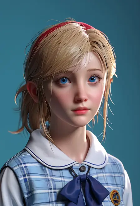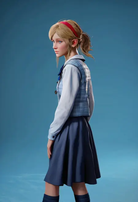 SherryBirkin, RE2, 白い短袖シャツ、濃い青のスカート、長い濃い青の靴下、白いスニーカー、薄い青のベスト、金髪、中程度の髪の長さ、薄い青の目、金髪の女の子、ハーフポニーテールのヘアスタイル、顔周りにほつれた髪、青いリボン、赤いヘアバンド