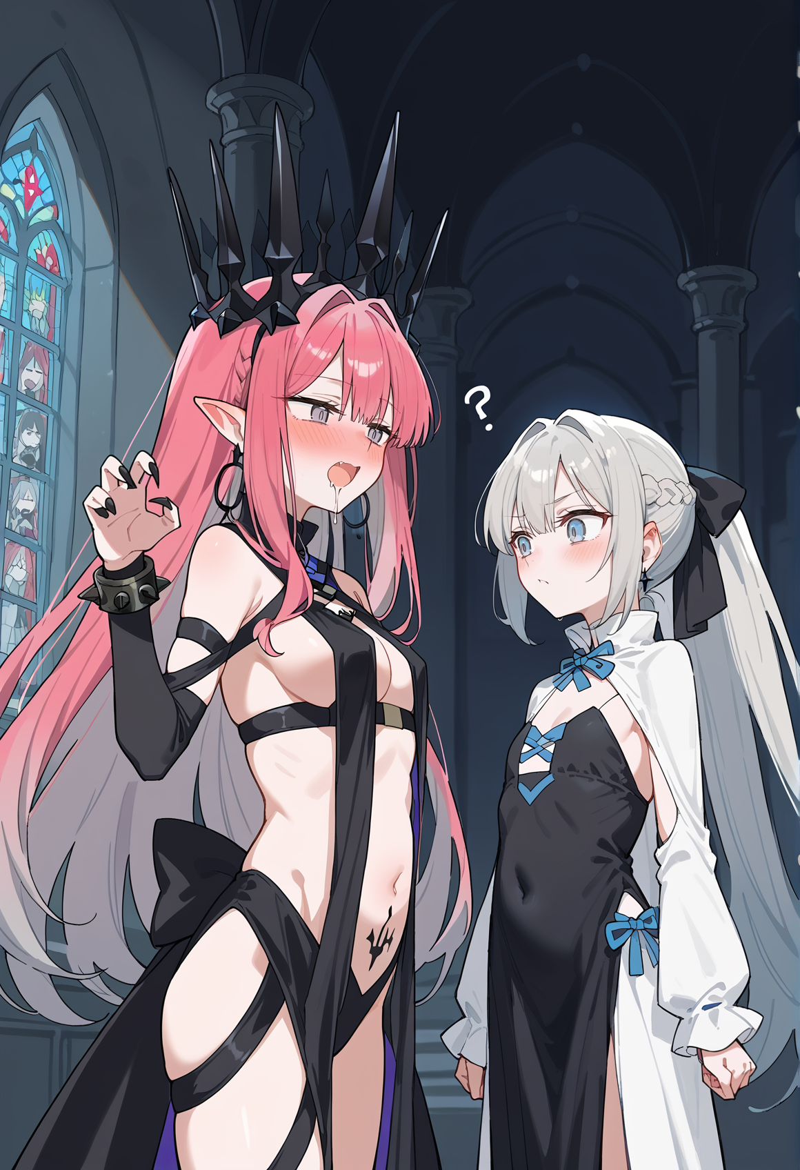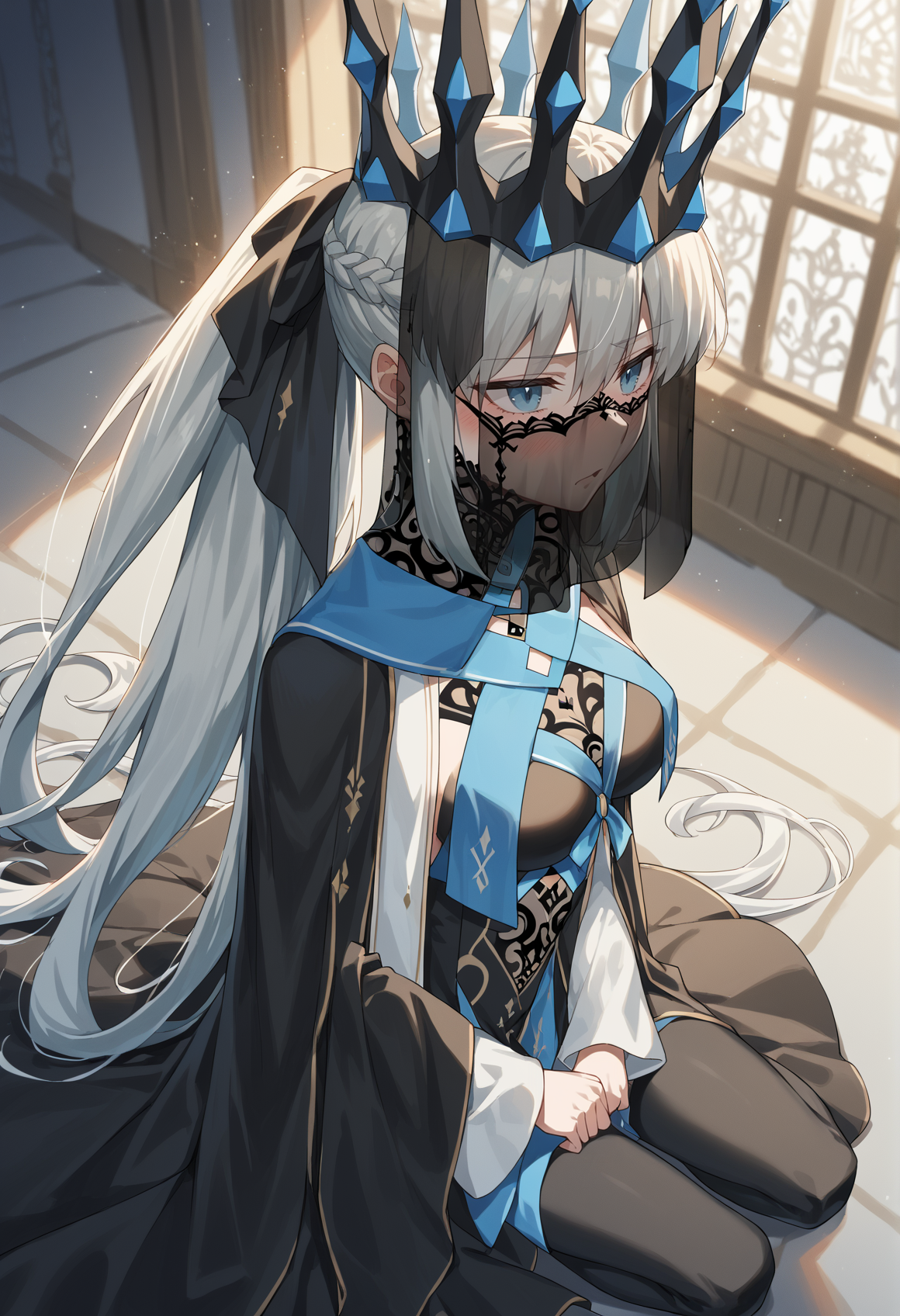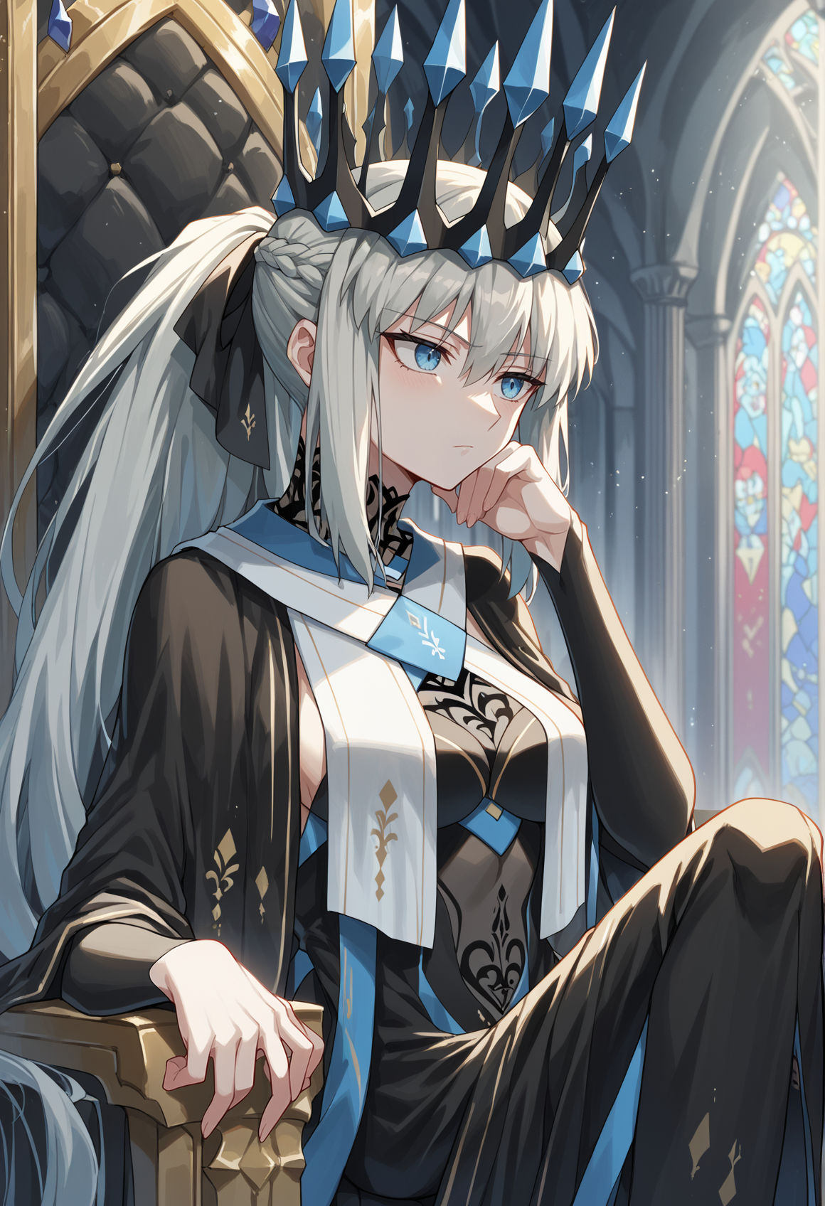 Third ascension: long hair, grey hair, blue eyes, very long hair, ponytail, Split ponytail, french braid, Crown, veil, spiked collar, black dress,