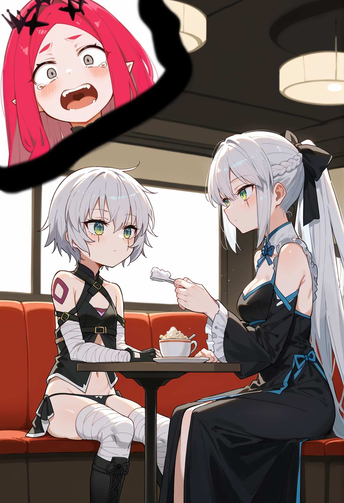 Vanilla: long hair, grey hair, blue eyes, very long hair, ponytail, black ribbon, hair ribbon, french braid, short dress, detached sleeves, cleavage, clothing cutout, detached collar, pelvic curtain