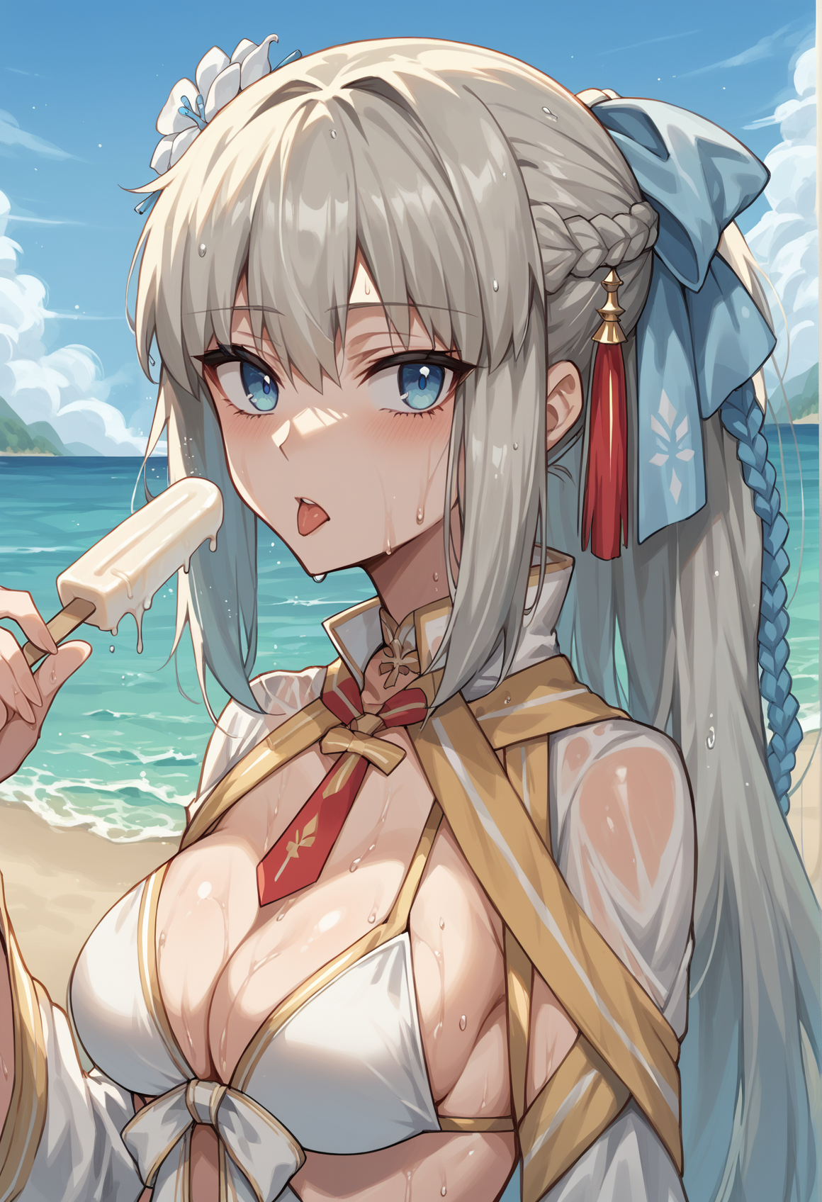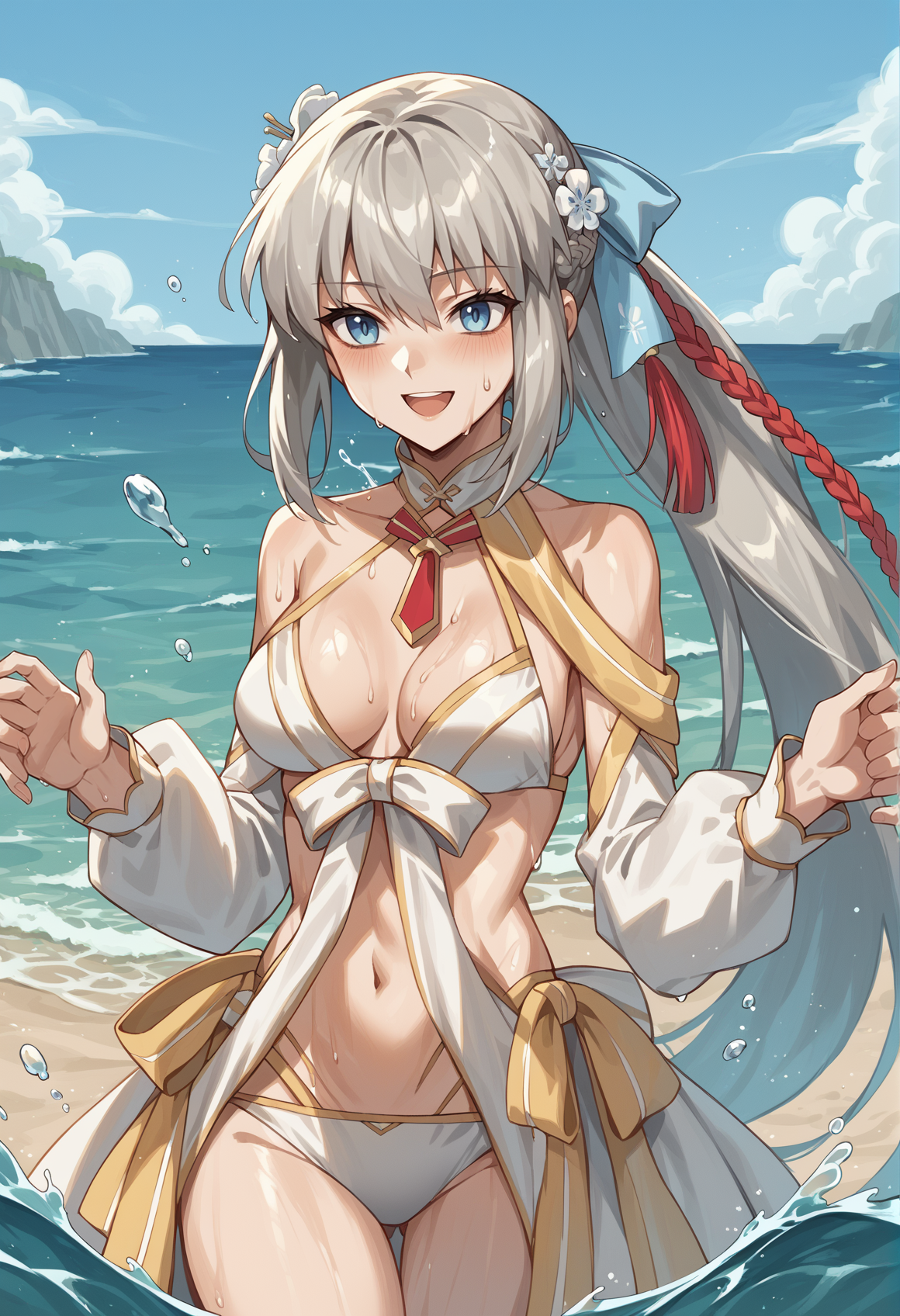 Swimsuit: long hair, grey hair, blue eyes, very long hair, braid, ponytail, hair flower, white bikini, detached collar, detached sleeves, blue ribbon, yellow ribbon