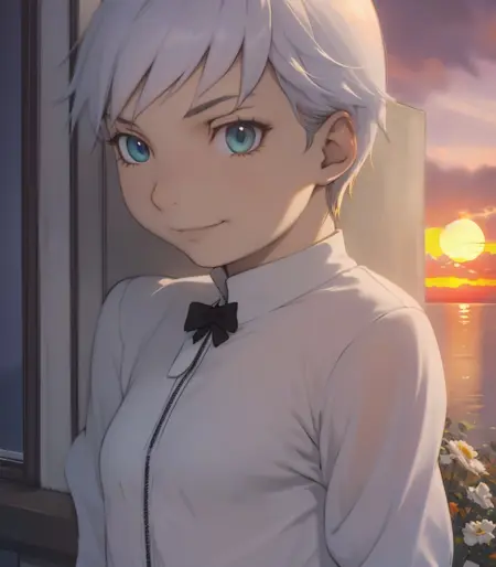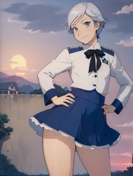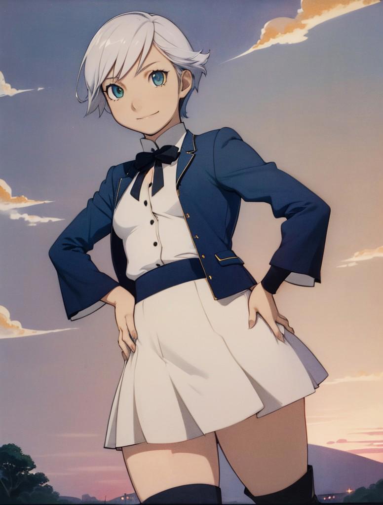 옷: 줄리엣 소매, 진한 파란색 유니폼, 치마, 흰 셔츠, 원본 옷, 활, 검은 활, 재킷, 단랑 재킷, 무릎 부츠, 긴 소매,