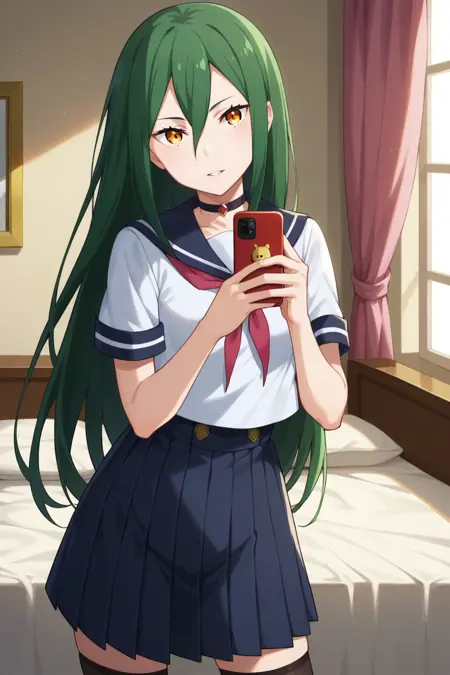 KJOcrusch, green hair, amber eyes, hair between eyes, long hair,