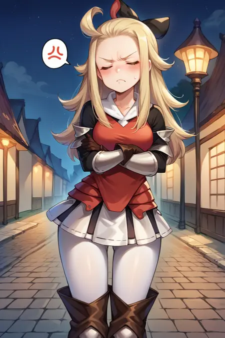 为她的《勇气默示录》造型添加:“bdEdea, blonde hair, ahoge, black bow, hair bow, red shirt, armored skirt, brown gloves, white leggings, thigh boots”