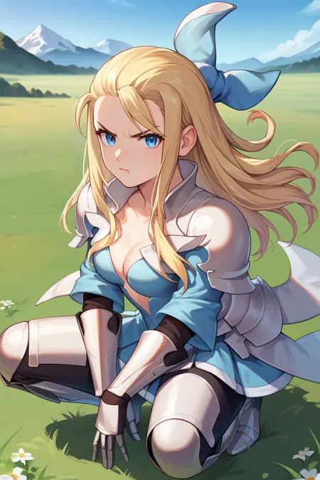 为她的《勇气默示录2》造型添加:“bsEdea, blonde hair, blue bow, hair bow, blue dress, cleavage, armor, gauntlets, armored boots”