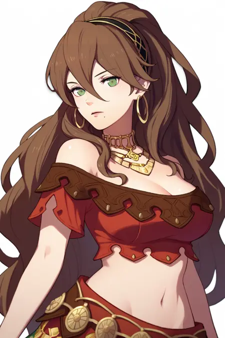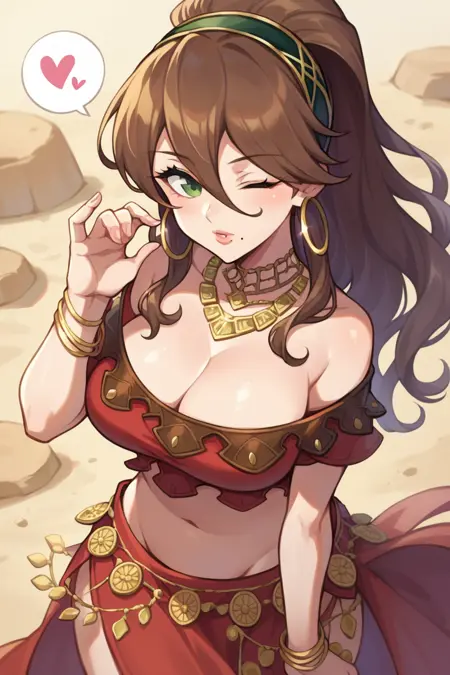 그녀의 전형적인 외모를 위해 "헤어밴드, 고리 귀걸이, 목걸이, 어깨 드러난 셔츠, 가슴, 빨간 셔츠, 허리, 사롱, 팔찌"를 추가하세요.
